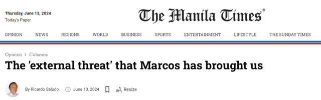 马科斯说的“外部威胁”从何而来?13日,菲律宾学者里卡多·萨鲁多在菲《马尼拉时报》上撰文认为:菲律宾的“外部威胁”,正来自马科斯政府的亲美政策。