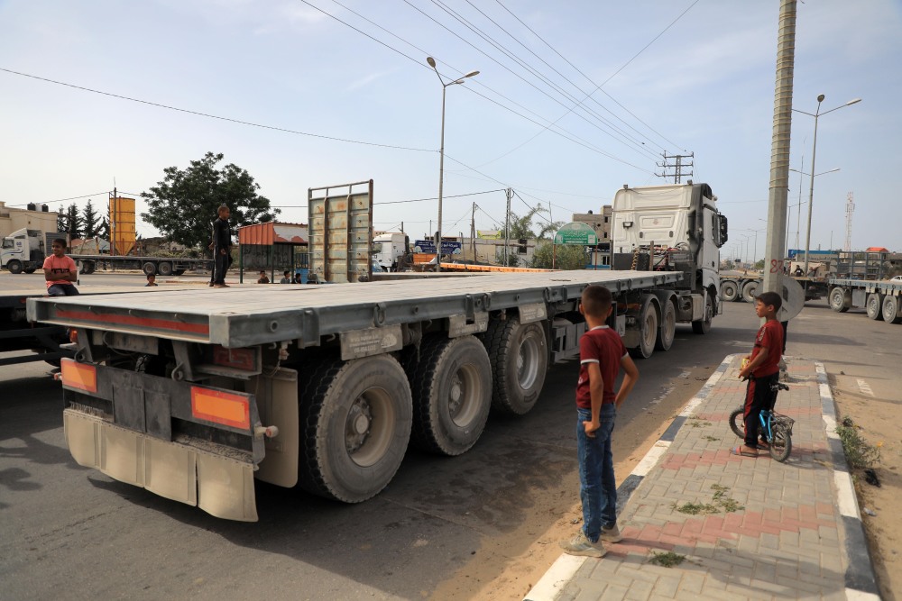 5月26日,在凯雷姆沙洛姆口岸加沙地带一侧,卡车等待装载援助物资。新华社发(里泽克·阿卜杜勒贾瓦德摄)