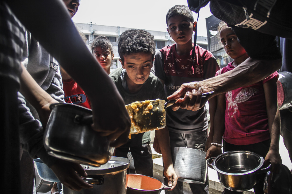 6月8日,在加沙地带北部杰巴利耶难民营,当地民众排队领取救济食物。新华社发(马哈茂德·扎基摄)