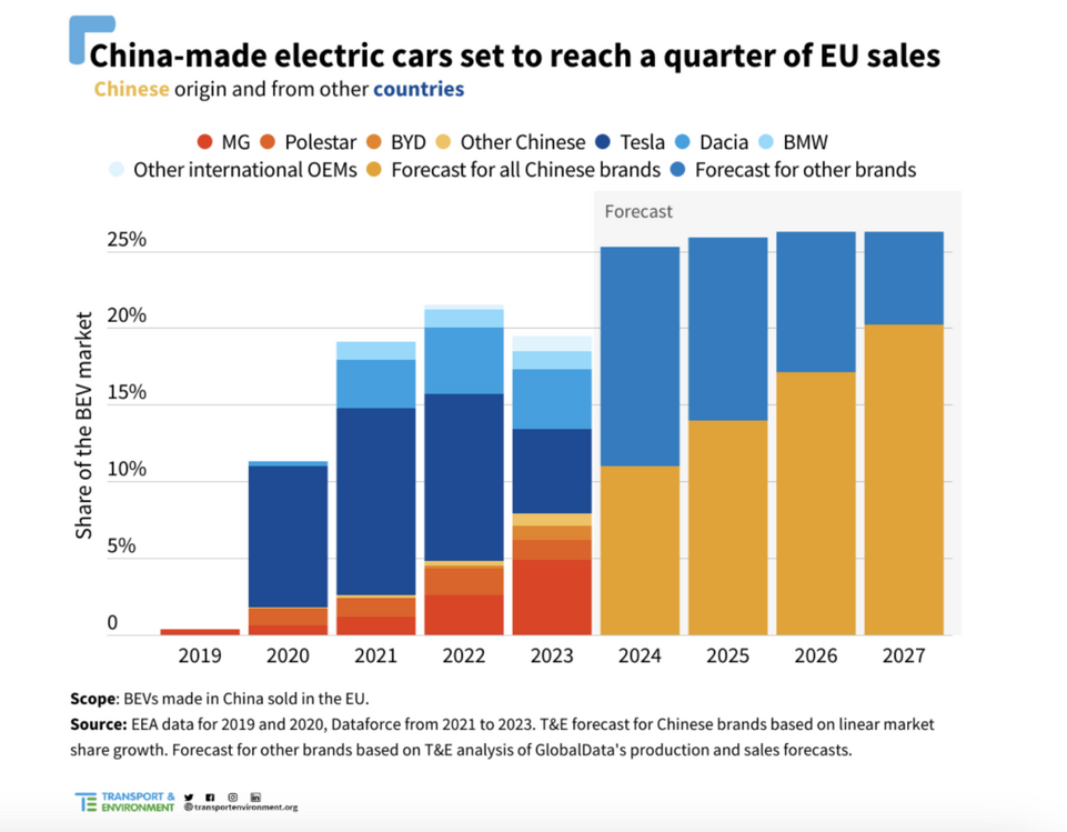 今年3月,正是这家机构做出预测,根据去年欧洲销售的电动汽车中近五分之一(19.5%)是在中国制造的事实,到2024年底,这一比例有望达到四分之一(25%)。