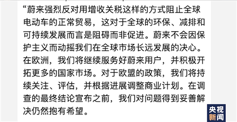 此外,蔚来汽车在回应记者采访时发来声明说,蔚来强烈反对用增收关税这样的方式阻止全球电动车的正常贸易,这对于全球的环保、减排和可持续发展而言是阻碍而非促进。蔚来不会因保护主义而动摇我们在全球市场长远发展的决心。
