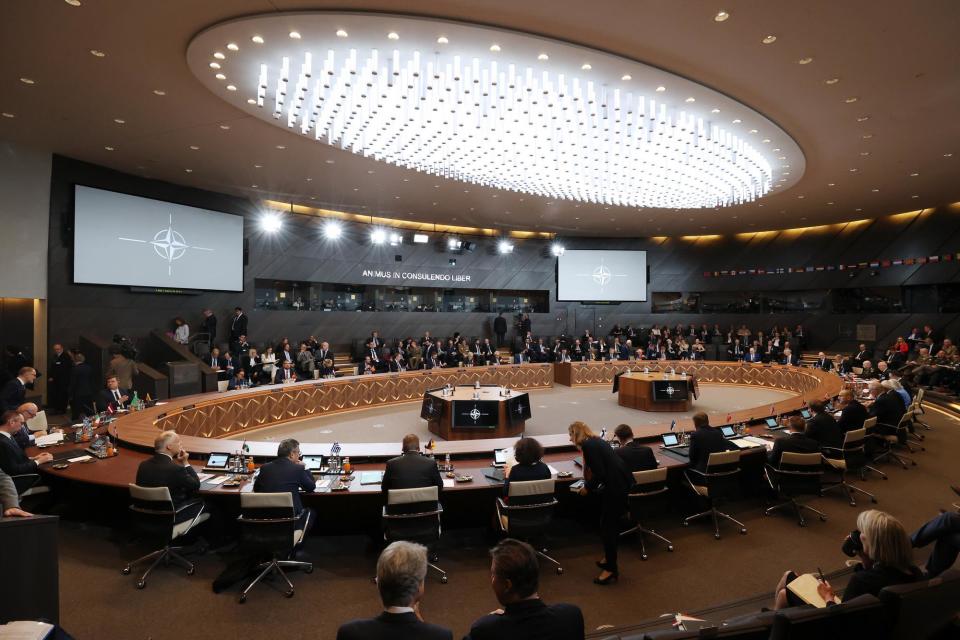 这是6月14日在比利时布鲁塞尔北约总部拍摄的北约防长会现场。新华社记者赵丁喆摄