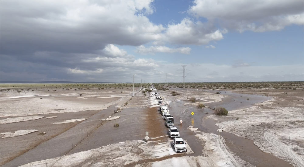 6月19日,在美国新墨西哥州威拉德附近,车辆堵在洪水后的高速公路上。新华社/美联