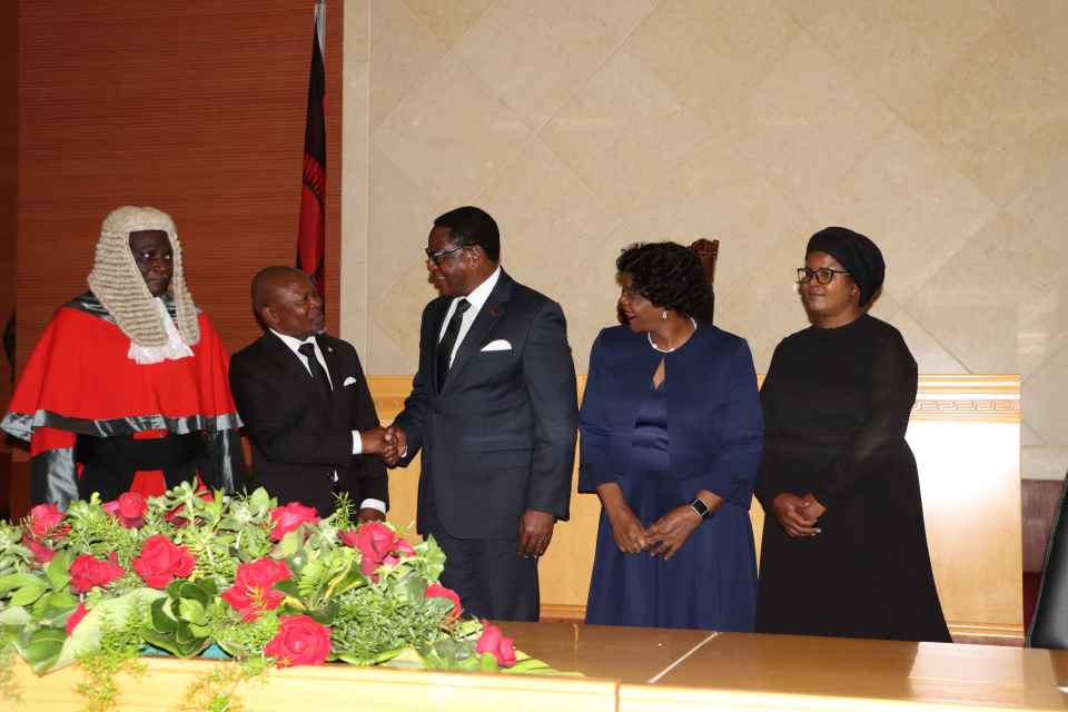 6月21日,在马拉维首都利隆圭,马拉维总统查克维拉(中)与迈克尔·乌西(左二)握手。新华社发(罗伊·恩科西摄)