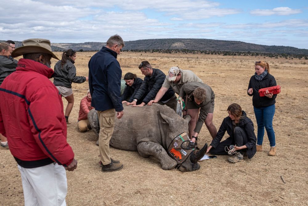 6月25日,在南非莫科帕内,科研工作人员与被注射过放射性物质的犀牛互动。新华社/法新