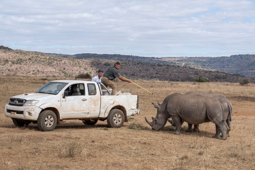 6月25日,在南非莫科帕内,科研工作人员与犀牛互动。新华社/法新