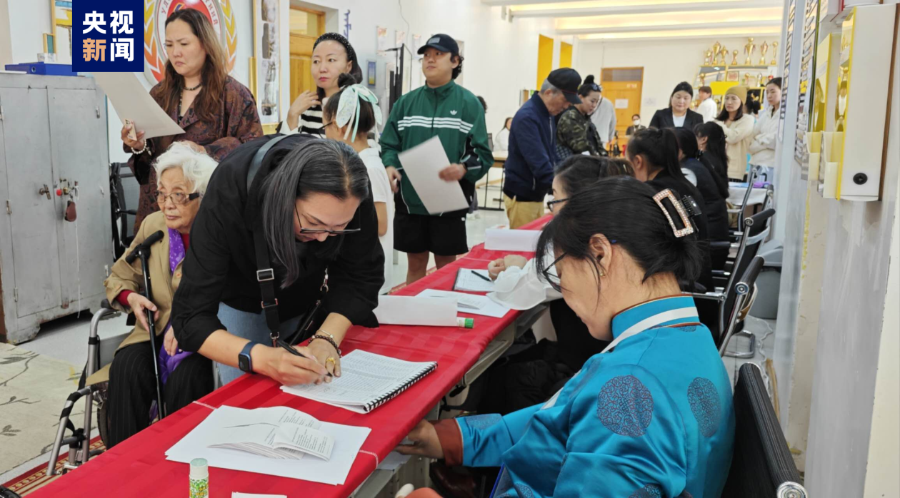 △蒙古国首都乌兰巴托市内的一处投票点,选民在进行登记