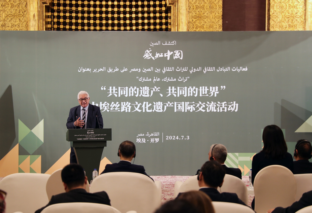 7月3日,在埃及首都开罗,埃及中国友好协会副会长阿里·希夫尼在中埃丝路文化遗产国际交流活动上致辞。新华社记者 王东震 摄