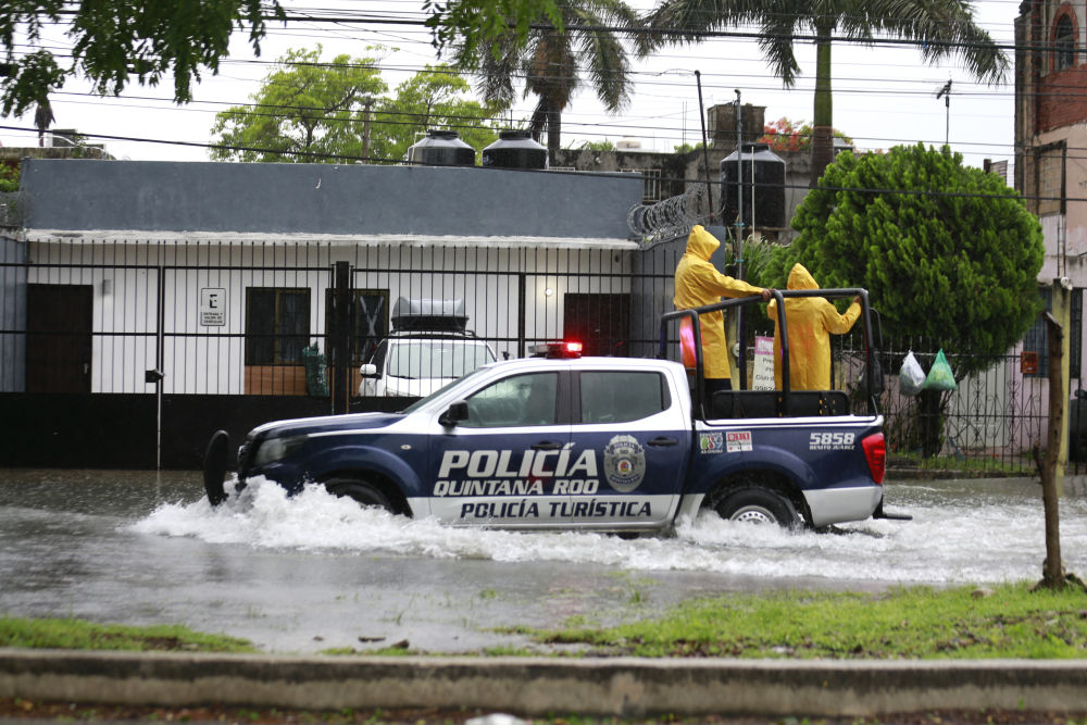 7月5日,在墨西哥东南部金塔纳罗奥州坎昆,警车驶过积水的道路。新华社发(阿尔韦托·巴尔德斯摄)