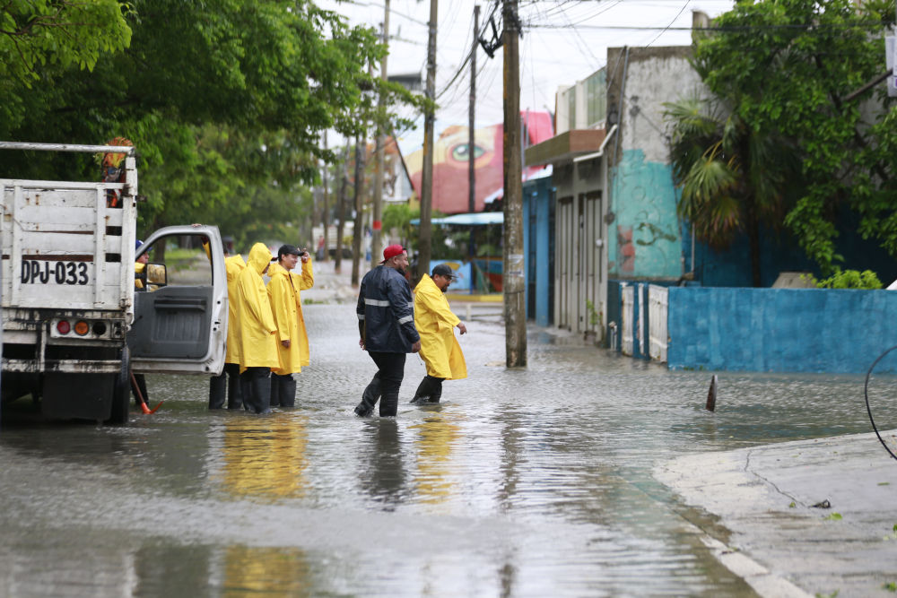 7月5日,在墨西哥东南部金塔纳罗奥州坎昆,人们查看路面积水情况。新华社发(阿尔韦托·巴尔德斯摄)