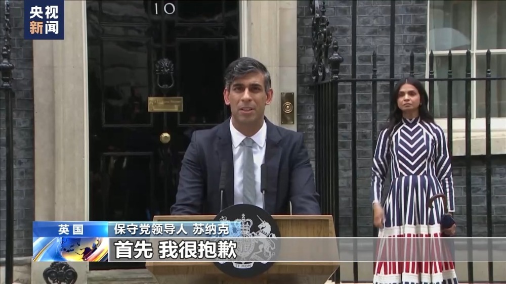 保守党领导人苏纳克当天稍早前在唐宁街10号发表讲话,宣布辞去首相职务,同时辞去保守党党首职务。