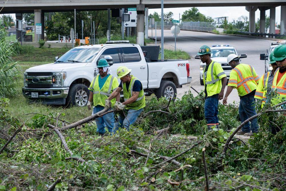 7月9日,在美国得克萨斯州休斯敦,工人清理公路上的树枝。新华社发(陈晨摄)