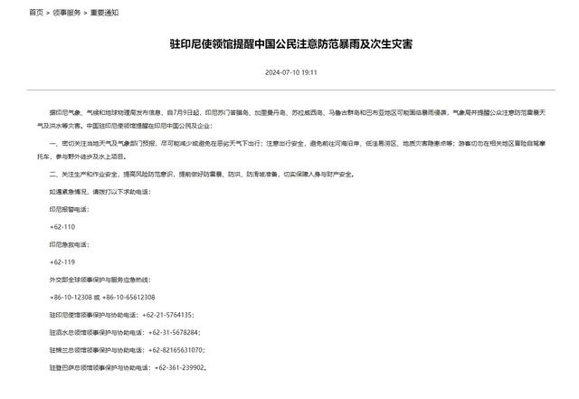 当地时间7月10日,中国驻印度尼西亚大使馆发文提醒中国公民注意防范暴雨及次生灾害。