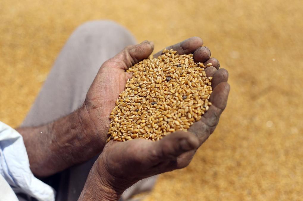 2022年4月30日,农民在埃及米努夫省展示刚收获的小麦。新华社发(艾哈迈德·戈马摄)