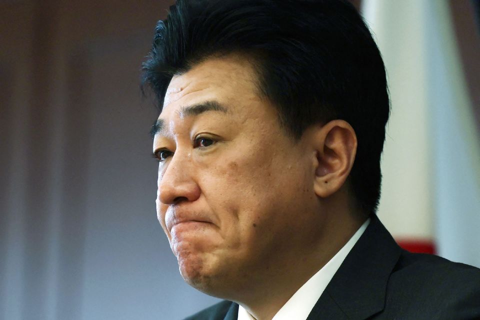 7月12日,在日本东京,防卫大臣木原稔在新闻发布会上鞠躬。新华社/法新