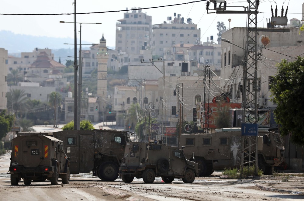 7月23日,在约旦河西岸北部图勒凯尔姆,以军车辆停在道路上。新华社发(艾曼·诺巴尼摄)