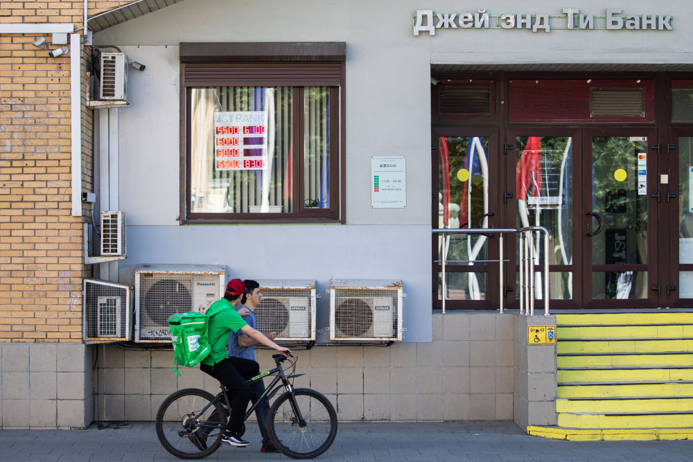 2022年6月29日,在俄罗斯首都莫斯科,送餐员经过一家银行的汇率显示屏。新华社记者白雪骐摄