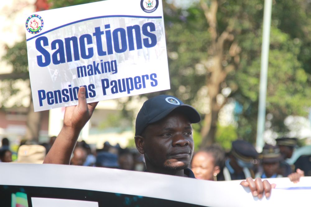 2023年10月25日,在津巴布韦首都哈拉雷,一名男子手持标语参加抗议西方非法制裁的游行。新华社发(塔法拉·木格瓦拉摄)