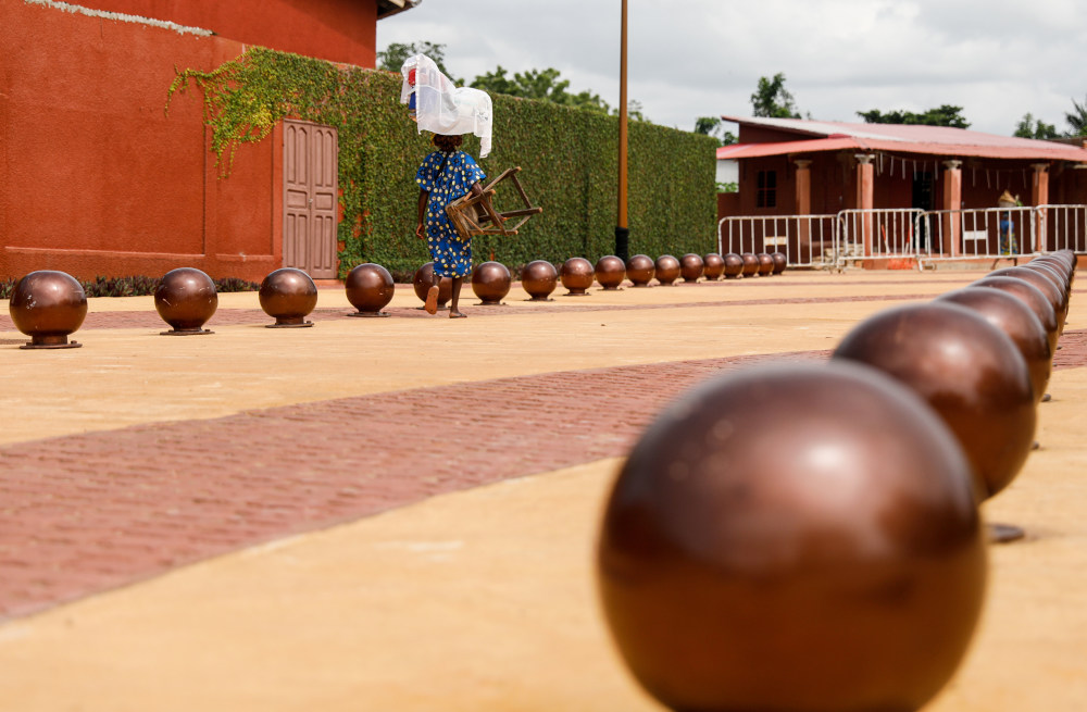 5月27日,在贝宁维达,一名女子走过查查广场。地上的圆球形装饰物象征着在此地被贩卖的奴隶。新华社记者 李亚辉 摄