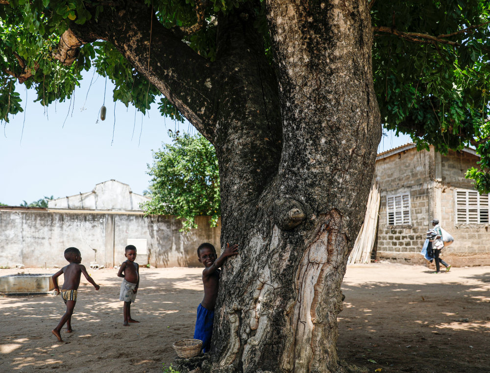 5月27日,在贝宁维达,几名儿童在“回归之树”树下玩耍。在过去,奴隶们被带上贩奴船前,会绕着这棵树走三圈,寓意着他们的灵魂在死后都会回到祖先的土地。新华社记者 李亚辉 摄