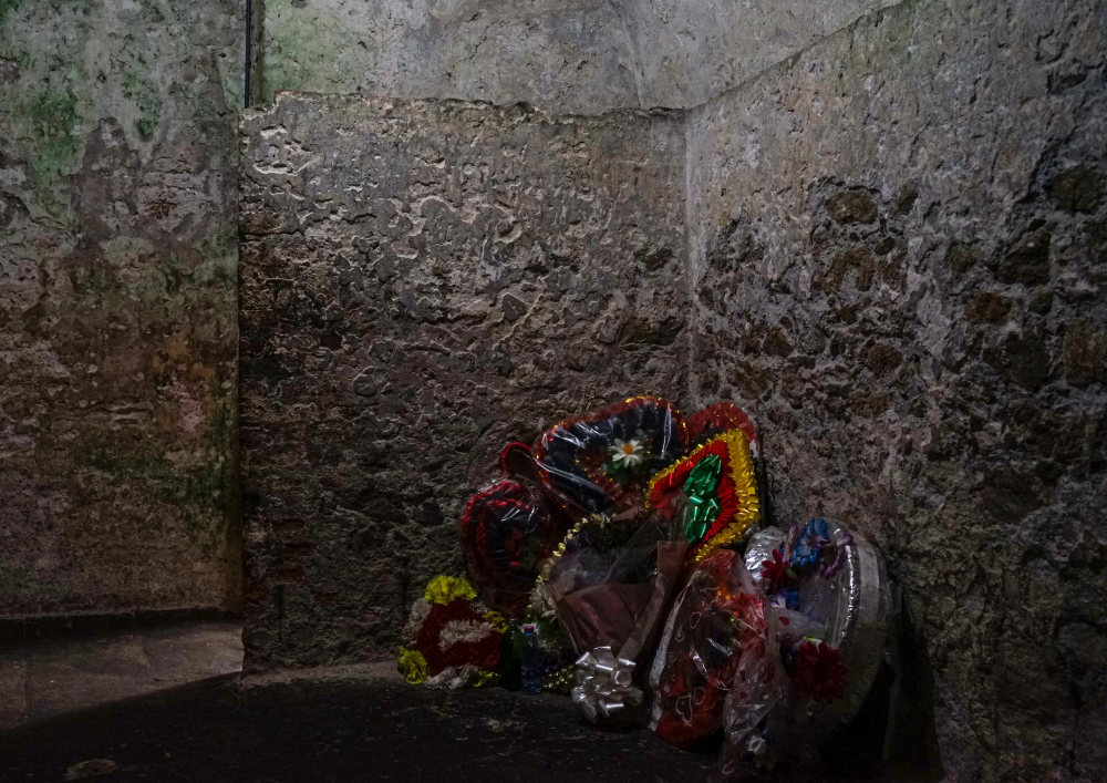 这是6月19日在加纳海岸角奴隶堡的监牢中拍摄的花圈,墙上布满奴隶反抗时挣扎的痕迹。新华社记者 李亚辉 摄