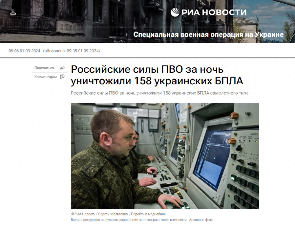 据俄罗斯国防部消息,当地时间8月31日晚至9月1日,俄军拦截并摧毁乌军158架无人机,其中9架在莫斯科市及莫斯科州上空被击落。