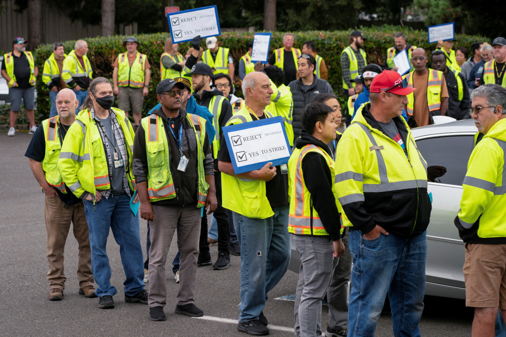 9月12日,在美国华盛顿州伦顿,美国机械工人和航天工人国际联合会的会员手举标语牌,表示拒绝与公司签订新劳资合同,支持罢工。新华社/美联