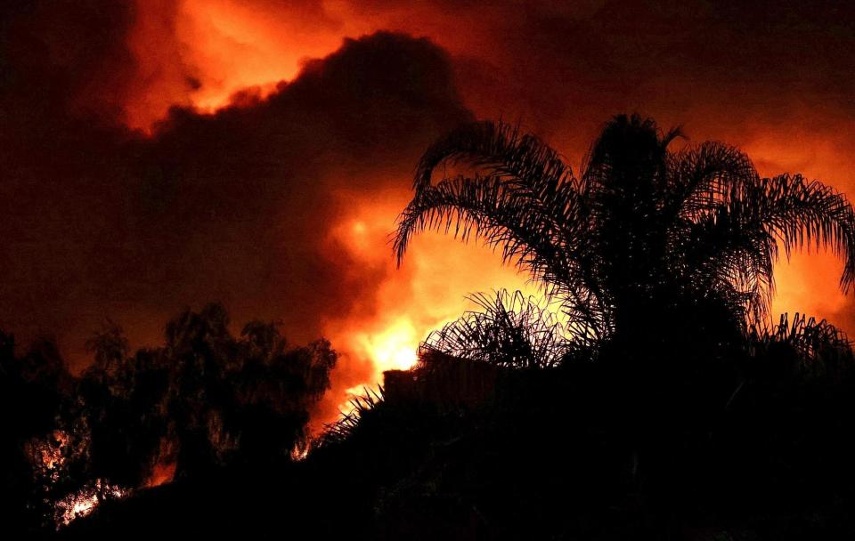 这是9月10日凌晨在美国加利福尼亚州奥兰治县特拉布科峡谷拍摄的山火。新华社发(邱晨摄)