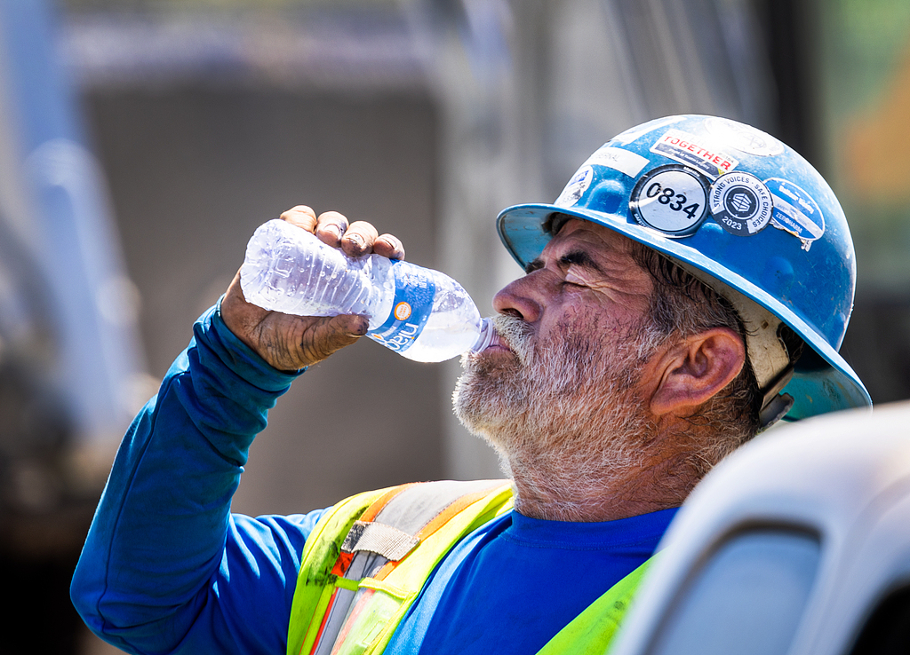 当地时间2024年9月5日,美国加州持续高温,一名建筑工人喝水降温。