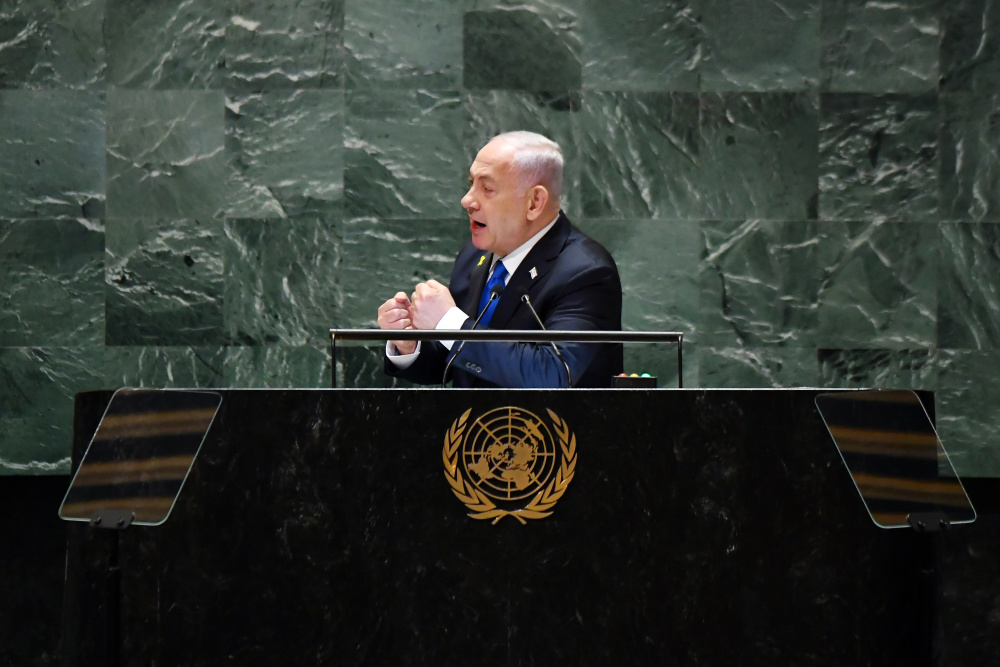9月27日,在位于纽约的联合国总部,以色列总理内塔尼亚胡在第79届联大一般性辩论上发言时双拳敲打讲台桌面。新华社记者李睿摄