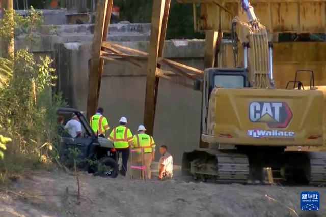 这张视频截图显示的是,10月16日,在美国密西西比州辛普森县,工作人员在桥梁坍塌事故现场工作。新华社/美联