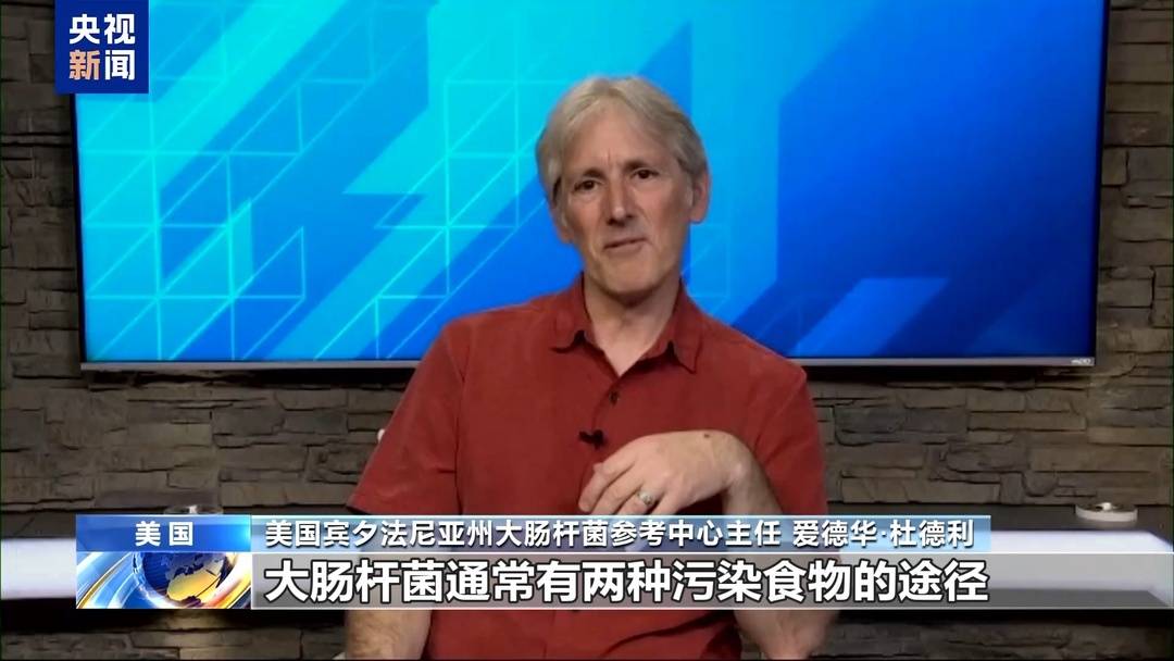 美国宾夕法尼亚州大肠杆菌参考中心主任爱德华·杜德利:大肠杆菌通常有两种污染食物的途径。一种是碎牛肉,它能作为感染途径。如果碎牛肉没有充分熟透,大肠杆菌就没有被完全杀灭。另一种是更常见的,好几次大肠杆菌感染暴发是因为初级农产品。一些动物排泄物污染了农田导致感染。