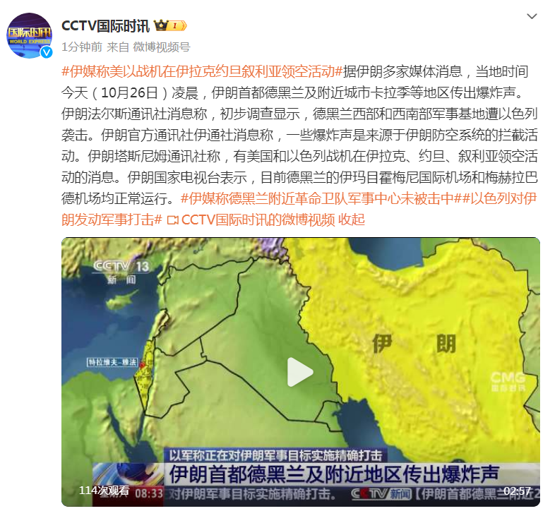 据伊朗多家媒体消息,当地时间今天(10月26日)凌晨,伊朗首都德黑兰及附近城市卡拉季等地区传出爆炸声。