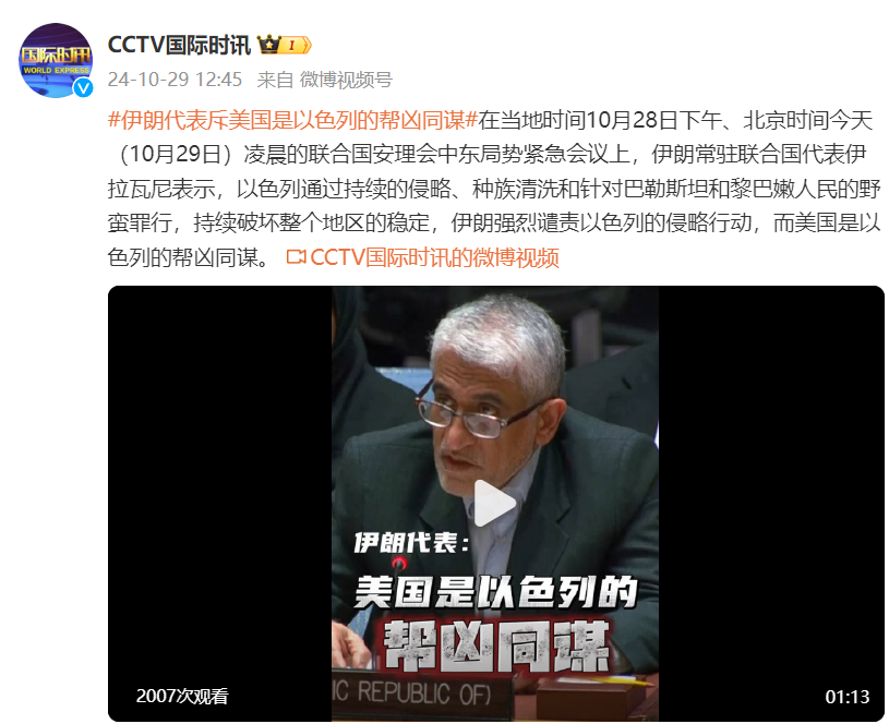 在当地时间10月28日下午、北京时间今天(10月29日)凌晨的联合国安理会中东局势紧急会议上,伊朗常驻联合国代表伊拉瓦尼表示,以色列通过持续的侵略、种族清洗和针对巴勒斯坦和黎巴嫩人民的野蛮罪行,持续破坏整个地区的稳定,伊朗强烈谴责以色列的侵略行动,而美国是以色列的帮凶同谋。
