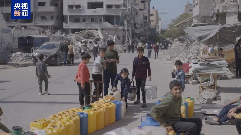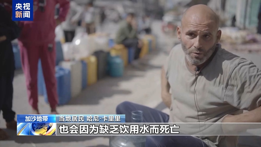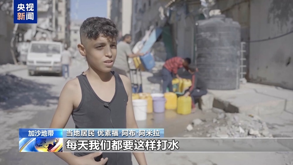总台报道员奥萨马·阿什:在加沙城,这样的场景每天都会上演,民众等待着装载了饮用水的卡车到来,而这些之前每天都会到来的饮用水车,现在每四天才会来一次。