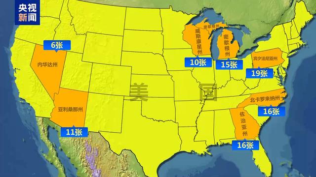 今年的“摇摆州”有七个,分别是宾夕法尼亚州、密歇根州、威斯康星州、亚利桑那州、佐治亚州、北卡罗来纳州和内华达州。其中,拥有选举人票最少的内华达州也有6张选举人票,而最多的宾夕法尼亚州拥有19张选举人票,七大“摇摆州”合计拥有93张选举人票,对于选举结果会起到重要影响。
