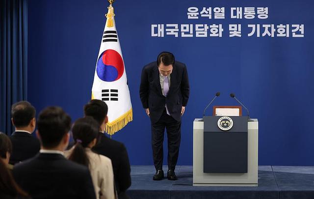 7日,在首尔龙山总统府,韩国总统尹锡悦发表对国民谈话,并就近期争议鞠躬致歉。尹锡悦表示,作为总统不应该找任何借口辩解,是我的疏忽和失德导致问题发生,我向国民道歉。