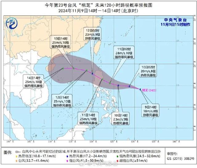 今年第23号台风“桃芝”(热带风暴级,英文名称:Toraji;名字来源:朝鲜;名字意义:朝鲜深山中的一种花,花能食用和入药)已于今天(11月9日)下午在菲律宾以东的西北太平洋洋面上生成,下午2点钟其中心位于菲律宾马尼拉偏东方向约1110公里的洋面上,8级(18米/秒)。预计,“桃芝”将以每小时25公里左右的速度向西偏北方向移动,强度逐渐增强,并向菲律宾吕宋岛以东洋面靠近,11日白天将在上述沿海登陆。