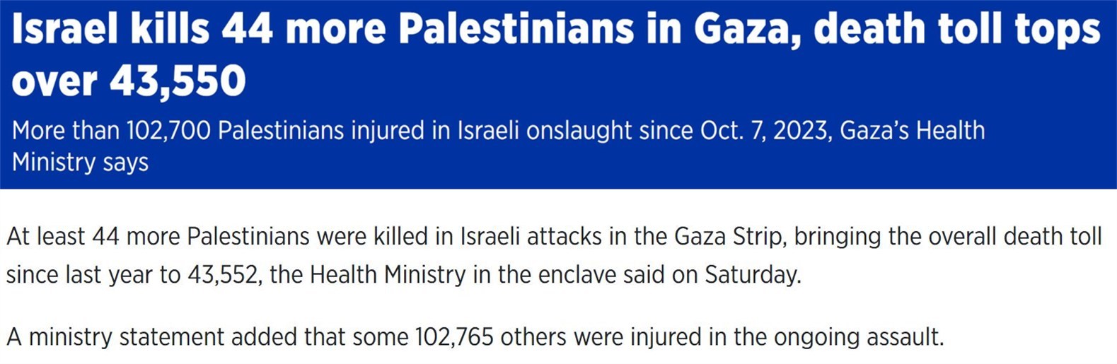 加沙地带卫生部门9日发表声明称,过去24小时以军在加沙地带开展的军事行动共导致44人死亡、81人受伤,这使得自去年10月7日巴以新一轮冲突爆发至今,以色列在加沙地带的军事行动造成的死亡人数升至43552人,受伤人数达到102765人。