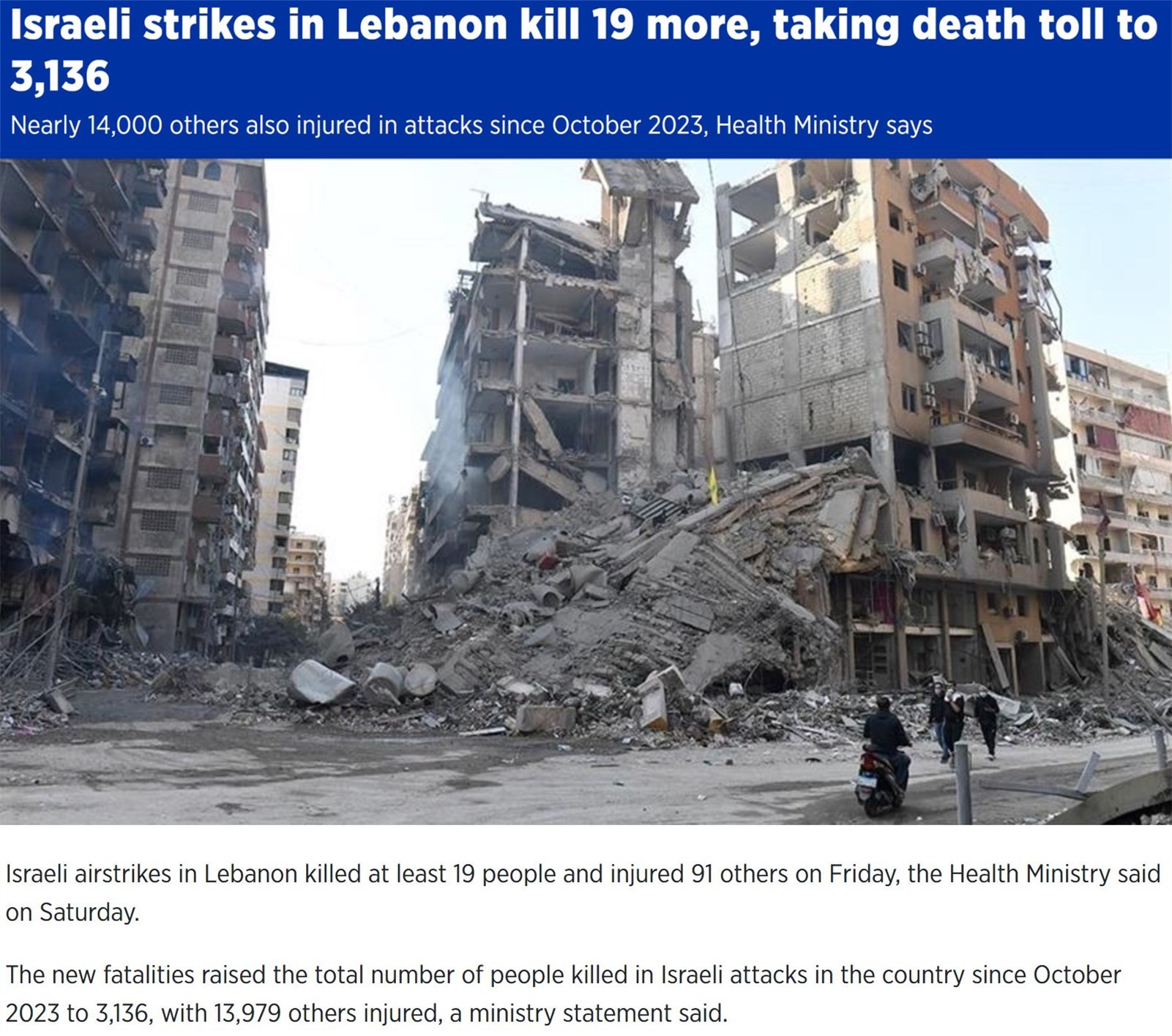 根据黎巴嫩卫生部8日的数据,自去年10月至今,以色列对黎巴嫩实施的军事行动已经造成3136名黎巴嫩人死亡,另有13979人受伤。