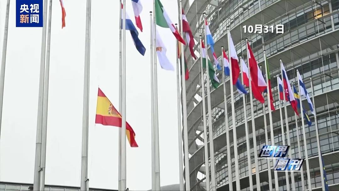 10月31日,西班牙洪灾后两天,在位于法国斯特拉斯堡的欧洲议会大厦,西班牙国旗和欧盟旗帜降半旗。