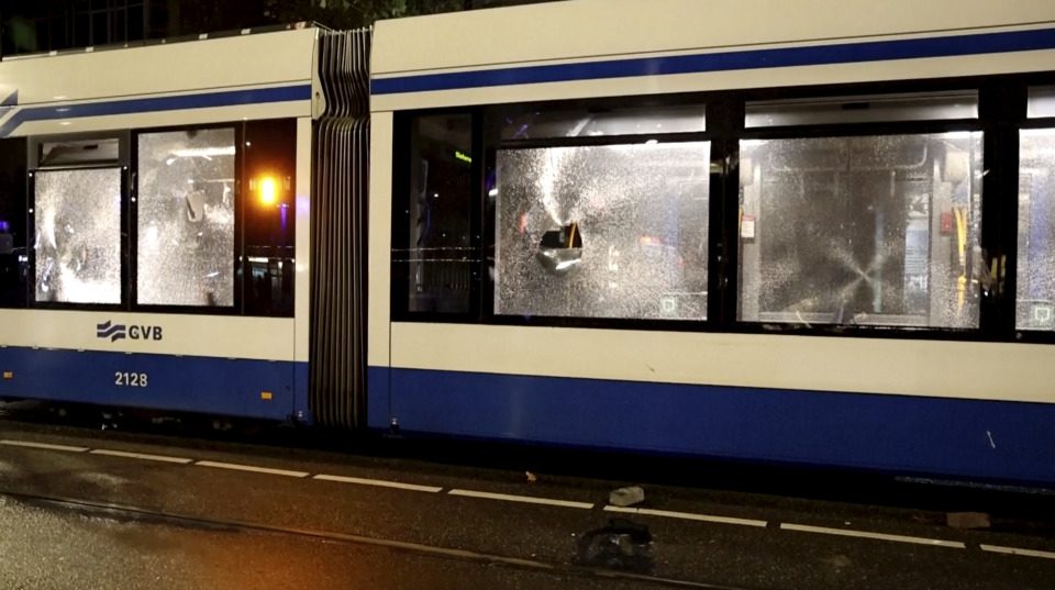 这是11月11日在荷兰首都阿姆斯特丹拍摄的在暴力事件中受损的电车(视频截图)。新华社/美联