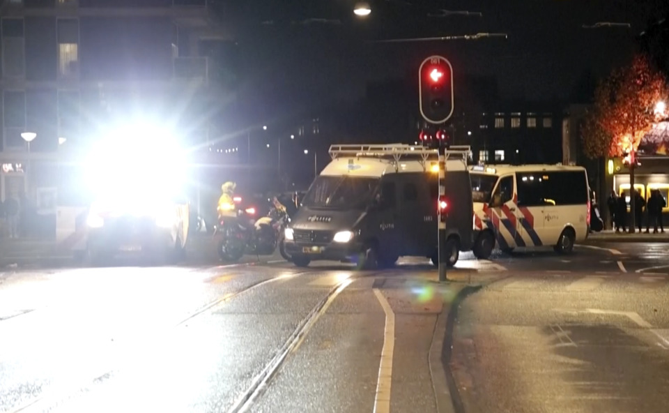 11月11日,在荷兰首都阿姆斯特丹,警方车辆与警察在暴力事件发生后巡逻(视频截图)。新华社/美联