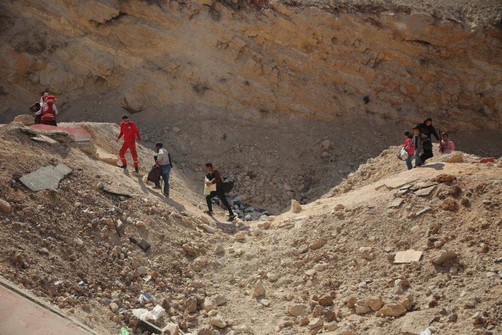 10月11日,在黎巴嫩迈斯纳边境口岸,叙利亚红新月会志愿者帮助准备前往叙利亚的流离失所者通过遭以色列空袭的公路。新华社记者李军摄