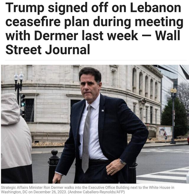 △《以色列时报》11月15日援引美国《华尔街日报》的报道称,美国当选总统特朗普在与以色列战略事务部长德默尔会面时签署了以黎停火草案。