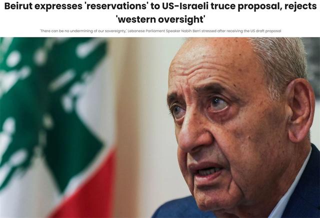 黎巴嫩议会议长贝里15日在接受当地媒体采访时表示,已收到美国关于在黎巴嫩实现停火的方案,但是他明确否认“协议方案包括允许以军可以在黎巴嫩自由采取任何形式的行动”。他表示,任何人都知道,这一点是不容讨论和不可接受的,黎巴嫩不会允许任何对其领土主权的侵犯。