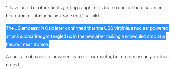 美国驻奥斯陆大使馆随后证实,“弗吉尼亚”号核动力攻击潜艇在按计划停靠特罗姆瑟附近的一个港口后,遭渔网缠住。