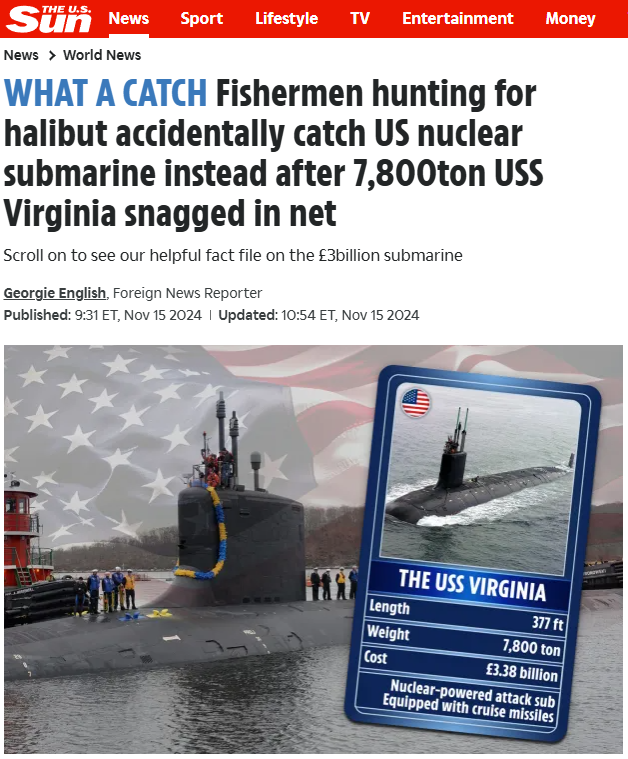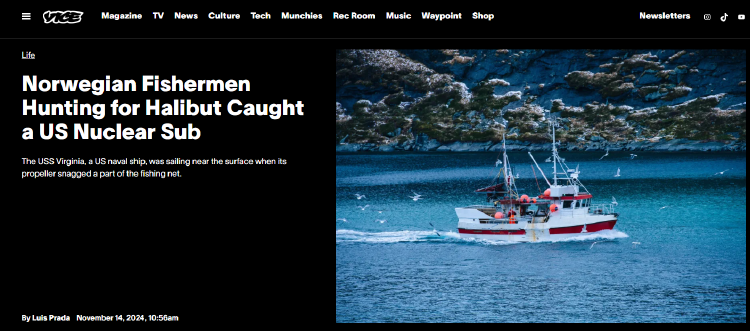 原来,长约377英尺(约合115米)、重达7800吨的“弗吉尼亚”号核动力攻击潜艇将挪威渔船放置的渔网拖到了两海里外的海域。渔网被卷进了该核潜艇的螺旋桨中,最终只得靠海岸警卫队帮助其切断渔网。