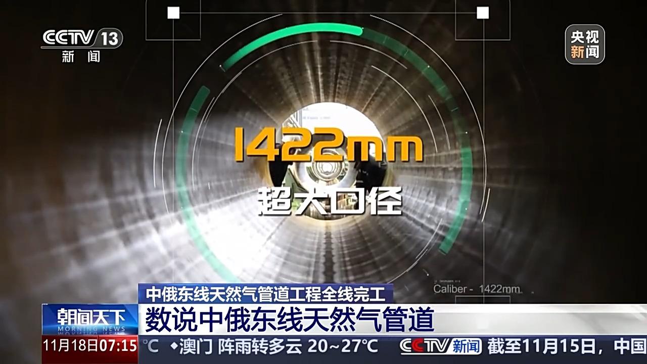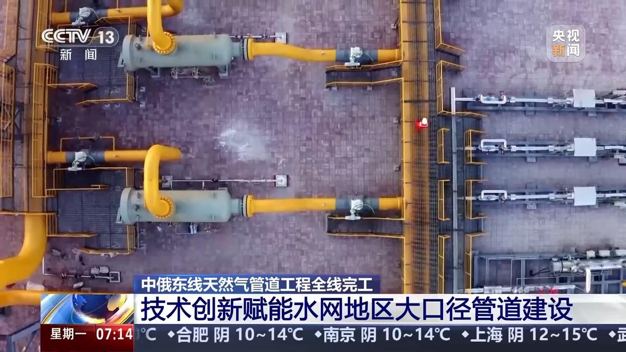 总台央视记者 张伟:这里是江苏省南通市中俄东线天然气管道施工现场,随着两根直径近1.5米的管道焊接在一起,五千多公里的中俄东线天然气管道工程全线完工。