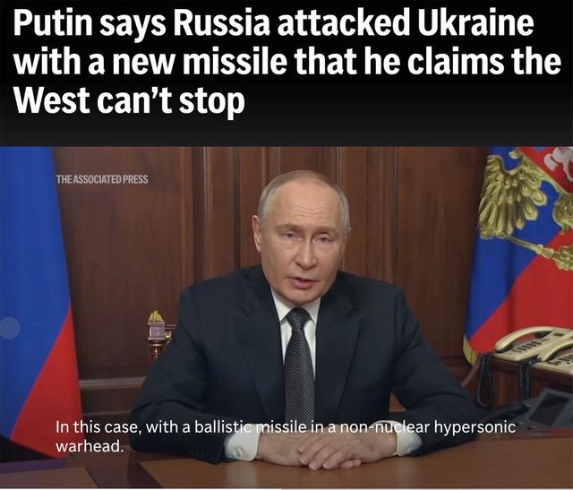 当地时间21日晚,俄罗斯总统普京发表电话讲话称,21日当天俄军对乌克兰军工企业进行了联合打击。攻击中,俄军测试了没有搭载核弹头、代号“榛树”的新型中程高超音速导弹。